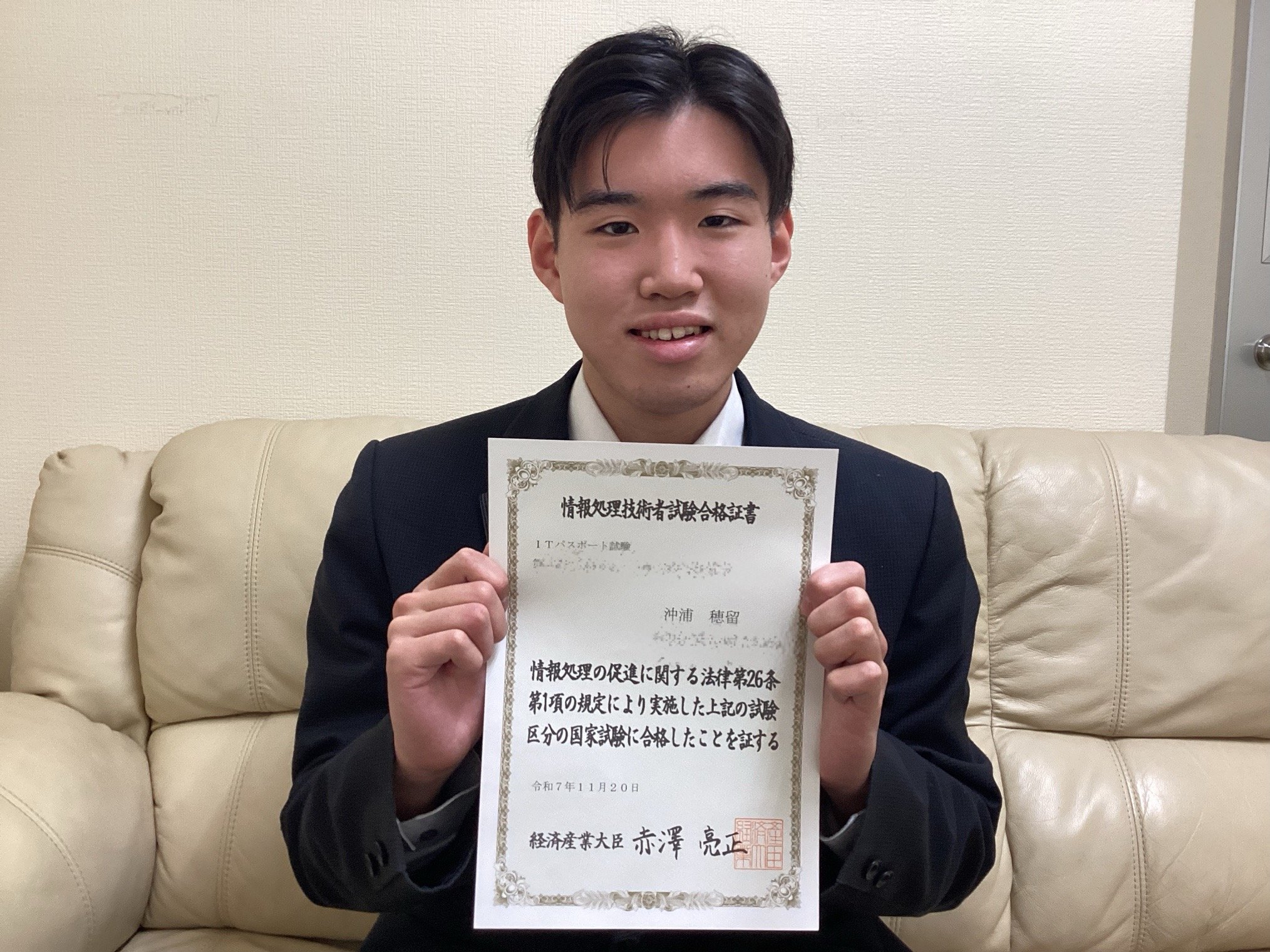 このたび、普通科キャリアコース3年の沖浦穂留さんが、国家資格である「ITパスポート試験」に見事合格しました。ITパスポート試験は、情報技術の基礎知識に加え、経営戦略、法務、情報セキュリティなど、社会人として必要な幅広い知識が求められる試験であり、キャリア形成の第一歩となる資格の一つです。