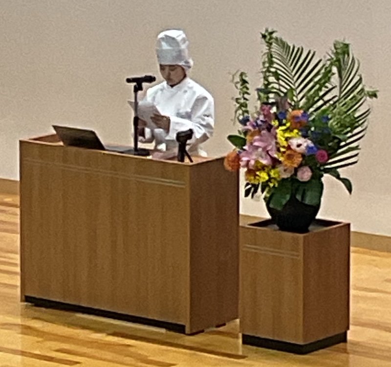 生徒代表誓いの言葉では,中間遥玲さん(河東中学校出身)が,料理の素晴らしさと楽しさをたくさんの人に伝えられるように,知識と技術を身に付けたいという決意を話しました。