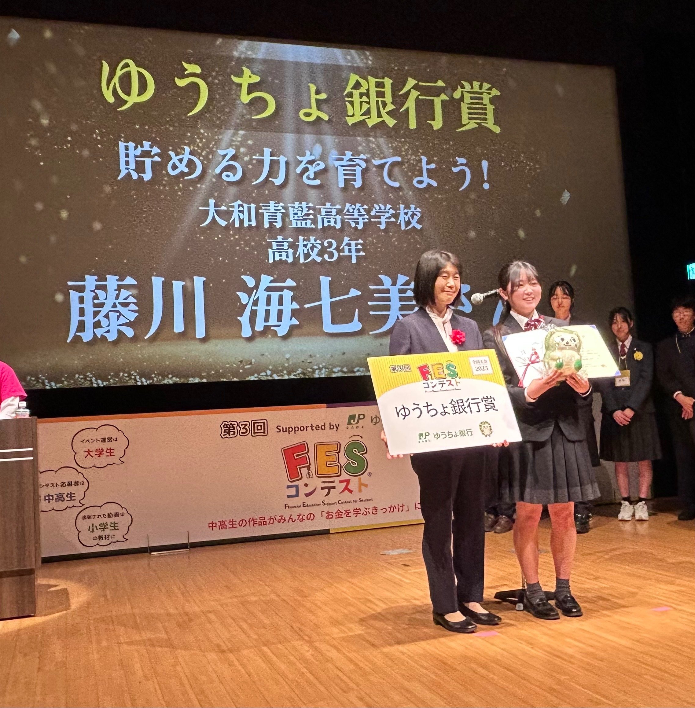 普通科キャリアコース3年、藤川さんが制作した動画作品が、第3回 FESコンテスト Supported by ゆうちょ銀行 全国大会において、企業特別賞「ゆうちょ銀行賞」 を受賞しました。
